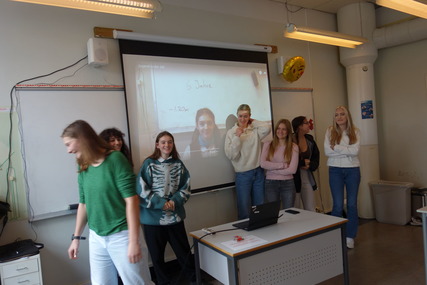 Thematisch befasste sich diese Gruppe der Schüler*innen mit dem Leben der Jugend in der DDR. Sie fragten sich: Wie war es dort aufzuwachsen? Wie gestaltete sich der Schulunterricht? Wie wurde die Freizeit organisiert? In Form eines Videos konnten die Zuschauenden das Leben und das Aufwachsen der hypothetischen Lisa in der DDR nachverfolgen. Eindrückliche Szenen aus dem nachgestellten Schulalltag beschreiben, wie stark dieser von der Ideologie des Sozialismus geprägt war. Die Lehrerin in dem Kurzfilm begrüßte die Schüler*innen mit der typischen Grußformel: „Für Frieden und Sozialismus seid bereit!“. Die Klasse erwidert daraufhinim Chor: „Immer bereit!“ Von dem nachgestellten Outfit der Pionierorganisation mit dem passenden roten Halstuch, welches die Protagonistin Lisa trug, war auch der für die Geschichtswerkstatt mit angereiste Zeitzeuge Thomas Drescher beeindruckt. Der Wunsch nach mehr Freiheit abseits des DDR-Alltags stellte die Gruppe treffend dar, indem sie zeigte, dass Lisa nachts Punk Konzerte in einer Kirche besuchte. Sie tat das heimlich, weil Punkmusik seitens der SED-Regierung als unsozialistisch und als Kritik am Staat gedeutet werden konnte. Im Anschluss an die Videovorführung betonte Thomas Drescher nochmals, wie beeinflusst der Alltag, die Freizeitgestaltung und der Schulunterricht der DDR von der Ideologie des Sozialismus war.