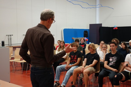 Eine persönliche Geschichte füllte auch die letzten zwei Schulstunden des ersten Projekttages: die von dem Zeitzeugen Peter Keup. Er ist in der DDR aufgewachsen und nach einem Fluchtversuch 1981 vom SED-Regime in verschiedenen Gefängnissen festgehalten worden, bis er schließlich von der Bundesrepublik freigekauft wurde. Peter Keup ist daran gewöhnt, seine Geschichte vor Publikum zu erzählen und ihm zuzuhören fiel leicht – diesen Eindruck vermittelten auch die Schüler*innen. Ruhig und aufmerksam saßen sie in der Aula, ihre Fragen stellten sie erst zum Schluss. Sie interessierte zum Beispiel, ob Keups Familie über seine Haft informiert wurde, was er bejaht, und wie er den Mauerfall erlebt hat. „Der Mauerfall war für mich kein schönes Ereignis, weil ich dachte, jetzt muss ich das Land wieder mit denen teilen, die mich eingesperrt haben“, so Keup. Auf die Frage, ob ihm jemals klar war, dass er in einer Diktatur lebte, sagte er, dass die Vergleichsmöglichkeit fehlte: „Man weiß um Defizite, aber was wirklich gefehlt hat, hat man erst gemerkt, als man woanders gelebt hat“. Außerdem sprach er von einem Stresstest der gegenwärtigen Demokratie, auch in Polen. Zwischen ihm und den Schüler*innen fand ein Austausch statt, auf Augenhöhe und bereichernd für beide Seiten: Seitens der Schüler*innen wurden Details aus seiner Biographie auch noch am nächsten Tag in den Workshop eingebracht und auch Peter Keup sagte nach dem Gespräch, es habe ihm sehr gefallen.